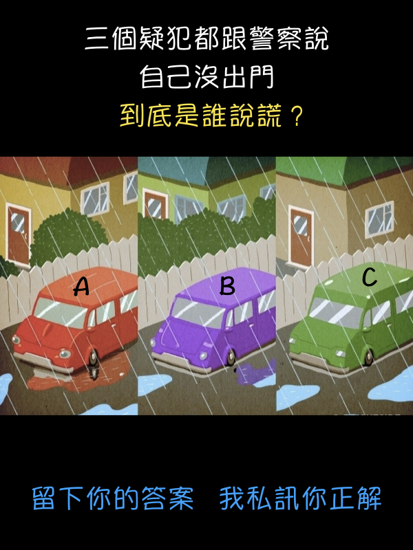 答案:A疑犯說謊,可以從他車子底下的水窪看出來,他車子有移動過!