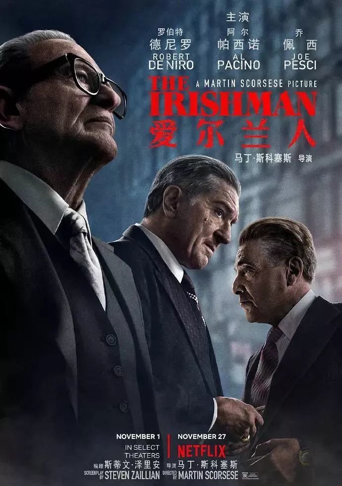 《爱尔兰人》为马丁·斯科塞斯执导的传奇巨制,罗伯特·德尼罗、阿尔·帕西诺和乔·佩西主演。通过二战老兵弗兰克·希兰的视角,讲述了战后美国有组织犯罪的故事。